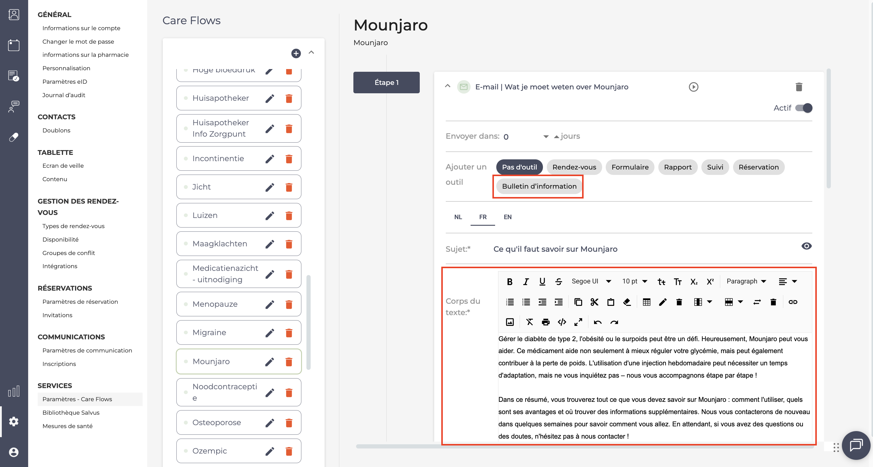 Par exemple: vous accompagnez un patient qui vient chercher du Mounjaro. Dans le bulletin d’information, vous partagez aussi des conseils de mode de vie liés au diabète et à la gestion du poids. Vous pouvez alors ajouter une étape supplémentaire dans le Care Flow avec un message tel que: