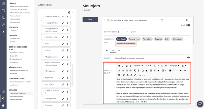Par exemple : Vous accompagnez un patient venu chercher du Mounjaro. Dans le bulletin d’information, vous partagez également des conseils de mode de vie liés au diabète et à la gestion du poids. Vous pouvez alors ajouter une étape supplémentaire au Care Flow avec un message tel que :