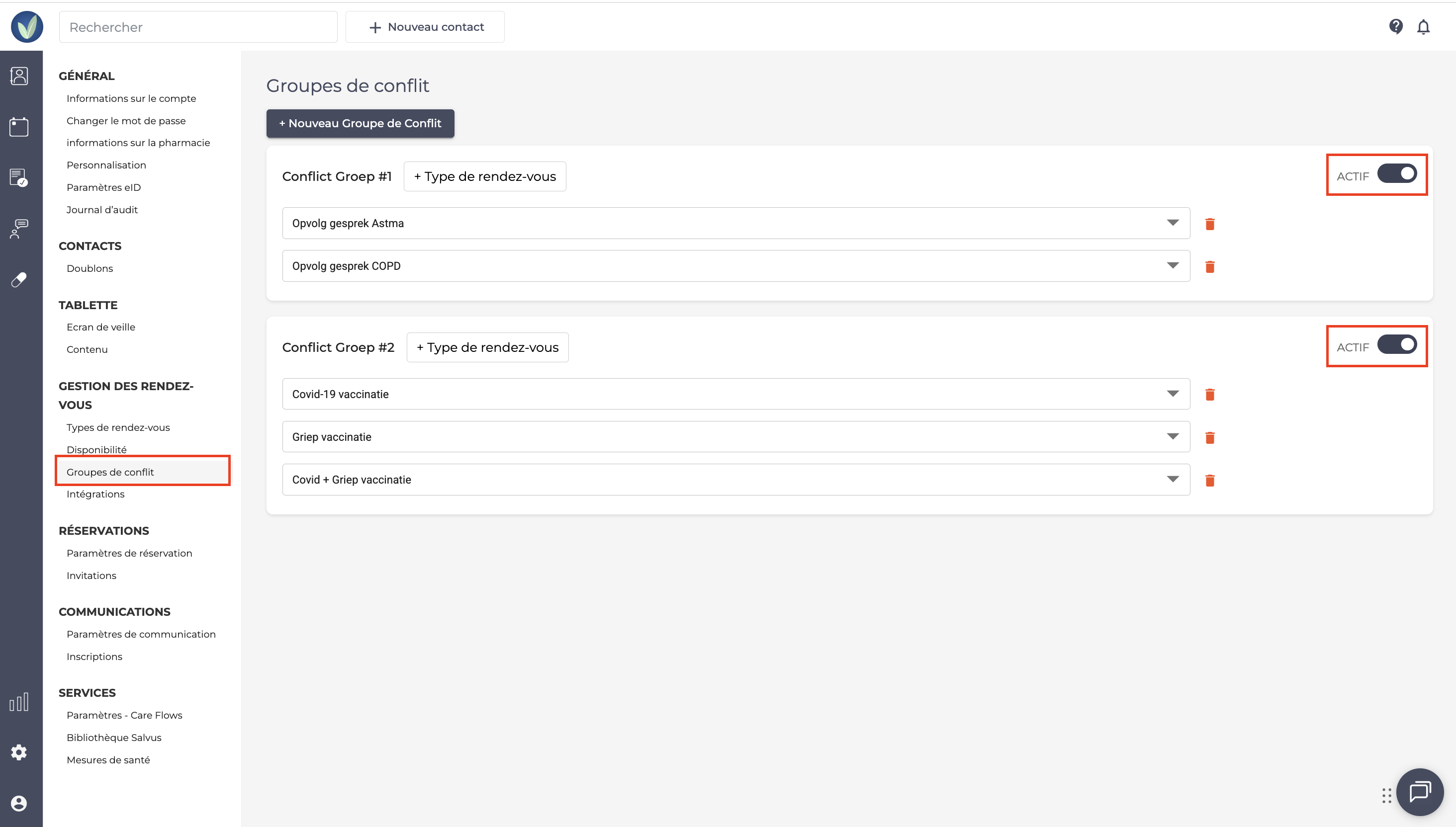 Allez dans : Paramètres > Gestion des rendez-vous > Groupes de conflit