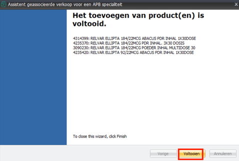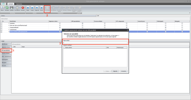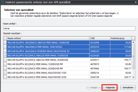 7. Ga naar 'APB specialiteiten'. Klik bovenaan op 'Toevoegen'. Zoek vervolgens het artikel op naam. Binnen één artikel kan u meerdere dosissen selecteren. Druk hiervoor op de shift knop en duid de gewenste artikelen aan.