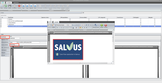 9. Ga terug naar 'Identificatie'. Hier gaan we onder 'Motivering' een afbeelding toevoegen als reminder om in Salvus een Care Flow op te starten. Klik hiervoor in het witte vak onder Motivering, waarna een nieuwe tab zal openen. U kan zelf kiezen of u hier een afbeelding wilt toevoegen of een korte zin.