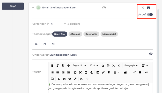 - Schrijf de inhoud van je mail onder 'Tekst' (ook dit doet u in NL, FR en EN).