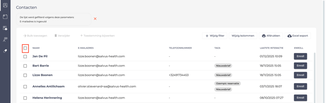 - Selecteer alle contacten op één pagina door op het vakje langs naam te klikken. Herhaal dit voor elke pagina om alle contacten te selecteren.