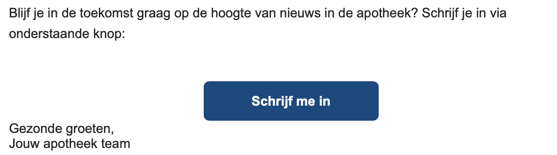 - Sterk aanbevolen: Voeg de tool 'Nieuwsbrief' toe aan uw uitnodiging om marketing toestemming van uw klanten te verzamelen. Gebruik bijvoorbeeld onderstaande zin om uw mail af te sluiten: